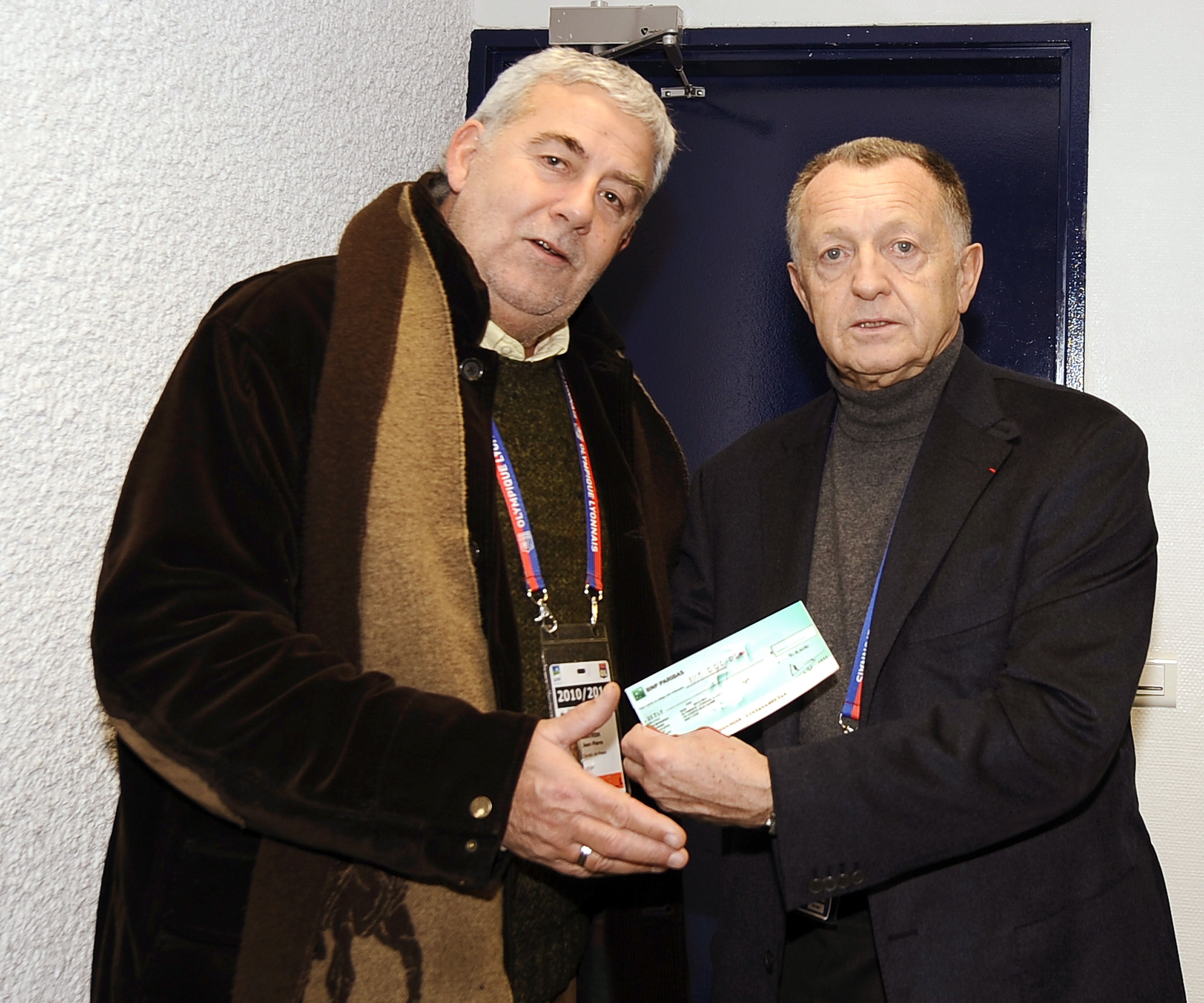 Jean Michel Aulas remet à Jean Pierre Buathier un chèque de 5 000 euros pour la section Rhône Alpes de l’UJSF (Photo : Arthur HAGOPIAN. Indépendant).